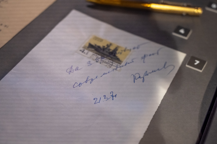 Особое внимание привлекает небольшой листок с почтовой маркой «Ракетный крейсер «Грозный» и личным автографом Николая Герасимовича. Этот корабль, созданный уже после войны, стал первым ракетным крейсером советского ВМФ — символом новой мощи флота, который Кузнецов так самоотверженно строил и защищал. Этот маленький автограф соединяет воедино его военное прошлое и послевоенное наследие.