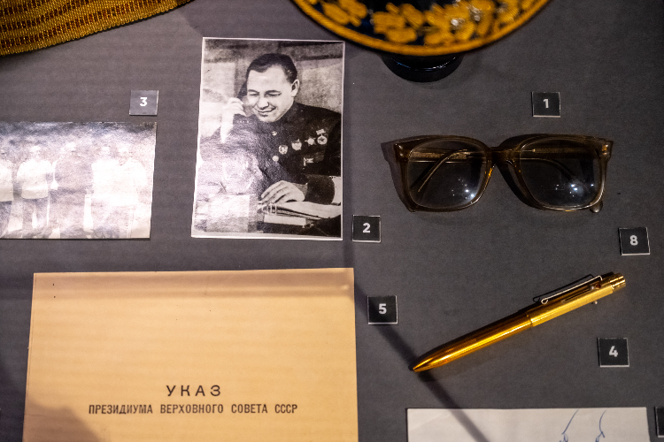 Это не просто экспонаты, а молчаливые свидетели эпохи. Здесь представлены элементы его адмиральской формы, сохранившие строгость и достоинство. Рядом — очки и простая авторучка, свидетели множества подписанных приказов и рассмотренных карт.