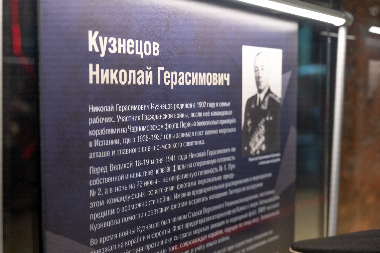Центральная часть экспозиции посвящена легендарному наркому ВМФ Николаю Кузнецову, который в ночь на 22 июня по своей инициативе привел флот в полную боевую готовность. Посетители увидят его адмиральскую форму, очки, авторучку и другие личные предметы, переданные в дар музею вдовой адмирала. Эти молчаливые свидетели эпохи позволяют прикоснуться к великой и трагической истории страны.
