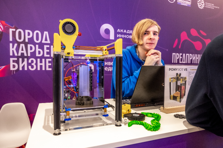 Форум стал витриной и для юных изобретателей, которые представили здесь свои стартапы. Внимание посетителей привлек проект Антона Логинова и его сокурсников из Псковского государственного университета. Команда привезла в Москву собственной разработки бесшумный 3D-принтер.