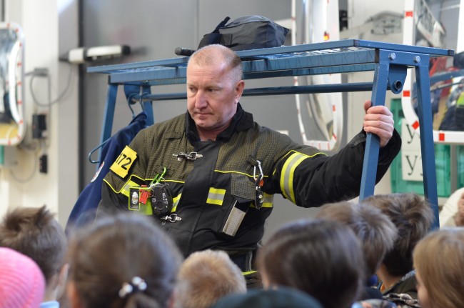 У входа в ПСО №217 ребят встретил помощник начальника караула Александр Андриянов. Он подробно рассказал экскурсантам о работе пожарных, продемонстрировал как за секунды надевается «боёвка» (боевая одежда пожарного) и рассказал о назначении каждого ее элемента.
