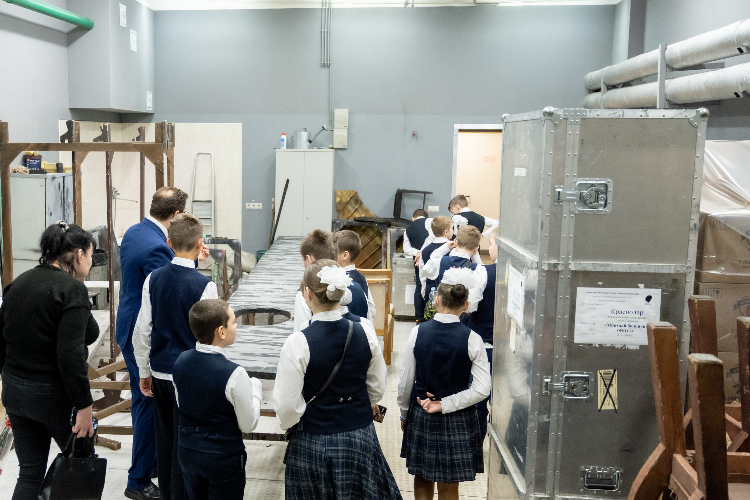 Оставив куртки в гардеробе, кадеты погрузились в мир, скрытый от глаз обычного зрителя. Их маршрут пролегал через многочисленные производственные цеха, где уже кипела работа перед вечерними показами. Ребятам показали святая святых — актерские гримерки, масштабные костюмерные, где хранятся тысячи образов, и пульт помощника режиссера, откуда управляется весь спектакль.