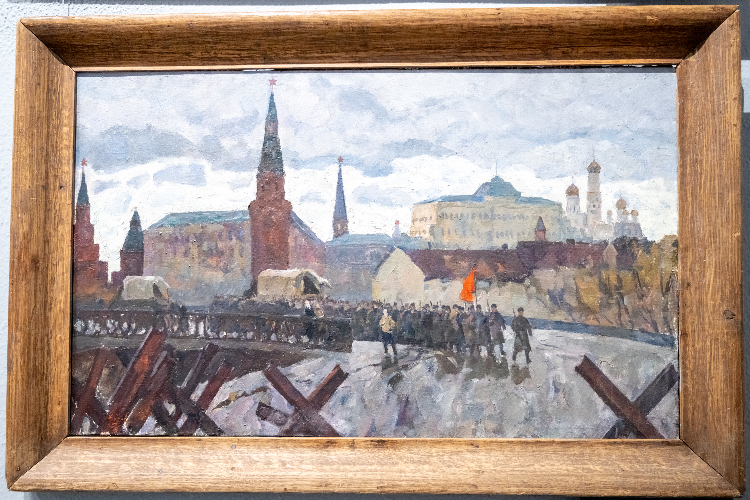 Переходя от картины к картине, замечаешь, как менялся облик нашей столицы. Вот на уютных московских улочках вырастают баррикады, противотанковые «ежи» ощетиниваются сталью, а в серое небо поднимаются огромные туши заградительных аэростатов.