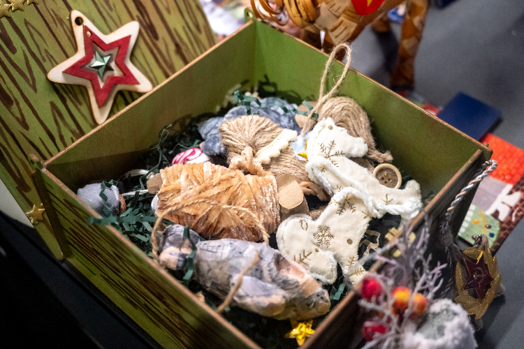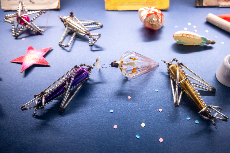 Например, наше внимание привлекло необычное украшение «Букет цветов» — маленькое произведение искусства, созданное вопреки войне. Есть и картонные звери — свидетели эпохи дефицита, которые сегодня выглядят душевнее любого современного пластика.