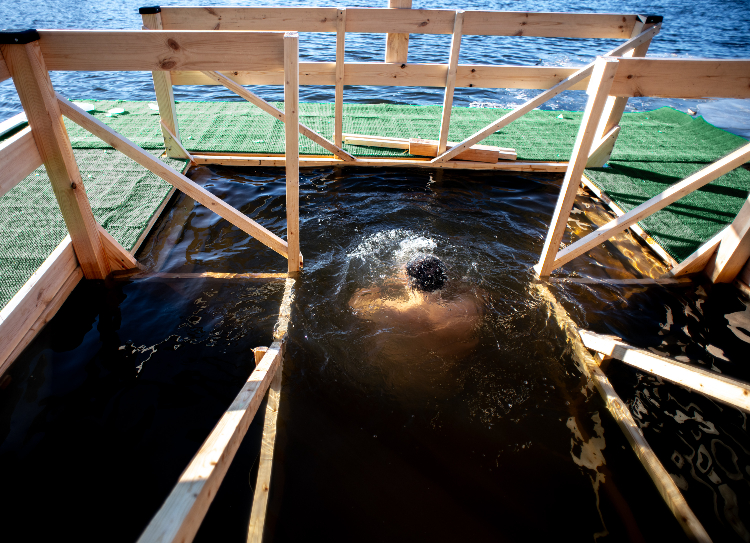 Зарядка перед стартом. Перед входом в ледяную воду рекомендуется сделать разминку или легкую пробежку — это поможет организму «проснуться» и избежать слишком резкого переохлаждения.