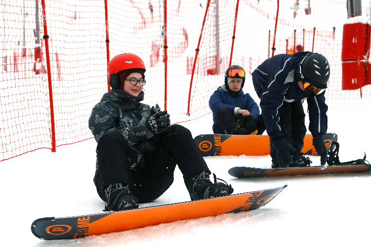 - Новички остаются на учебном склоне, где учатся держать баланс, осваивают правильную стойку и азы скольжения.