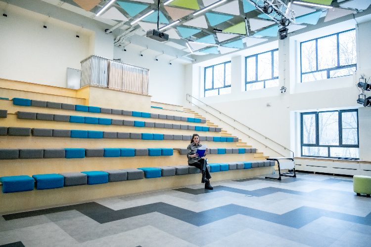 Помимо учебных классов, новый стандарт преобразил и общие зоны. Актовый зал стал большим открытым пространством (open space), где стерта граница между сценой и зрителем. Площадка легко трансформируется под любые мероприятия, позволяя детям проявлять творчество без технических ограничений.