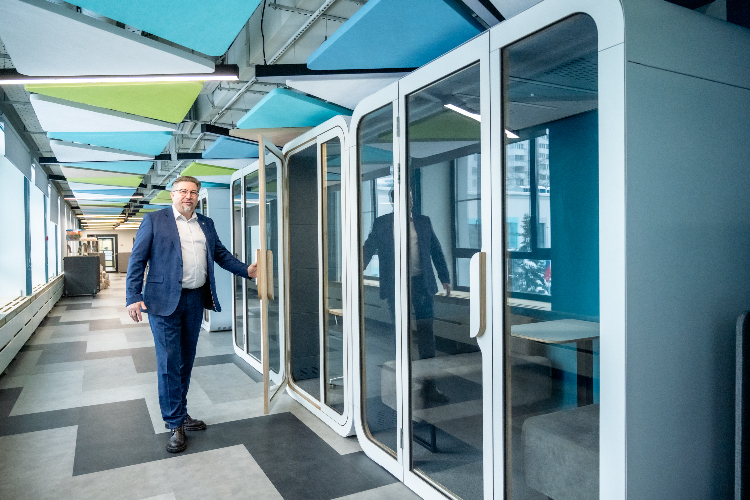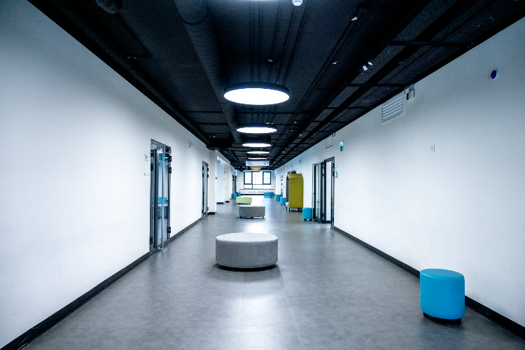 Особенность проекта — рекреации, которые перестали быть просто коридорами. Теперь это полноценные зоны отдыха: здесь стоят пуфы, банкетки и даже акустические кабинки тишины с розетками для зарядки гаджетов. Стены превратились в пространство для творчества, а навигация стала интуитивно понятной — каждый кабинет промаркирован не только номером и буквой, но и именем учителя.