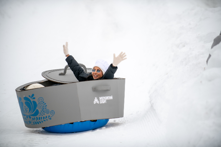 Пельмени на виражах: знаменитости и блогеры устроили гонки на тюбингах в Крылатском