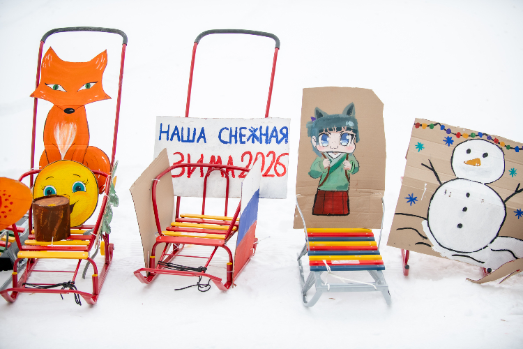 Самые смекалистые подошли к спортивным снарядам с креативом, украсив сани мандаринами, героями мультфильмов и даже бутафорскими пельменями.